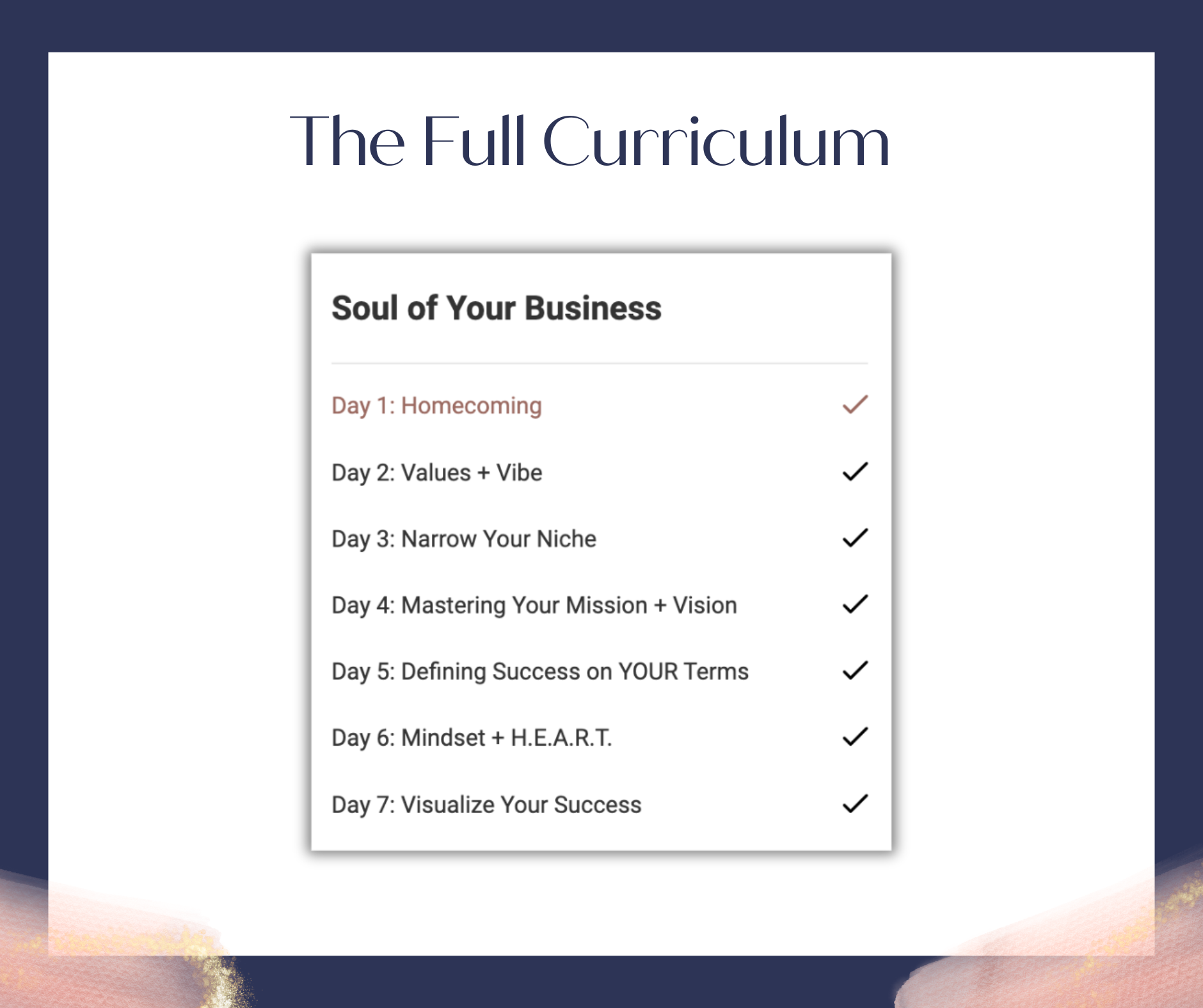 Day 2: Values + Vibe – Define the core values that will guide every aspect of your business and set the tone for your brand.